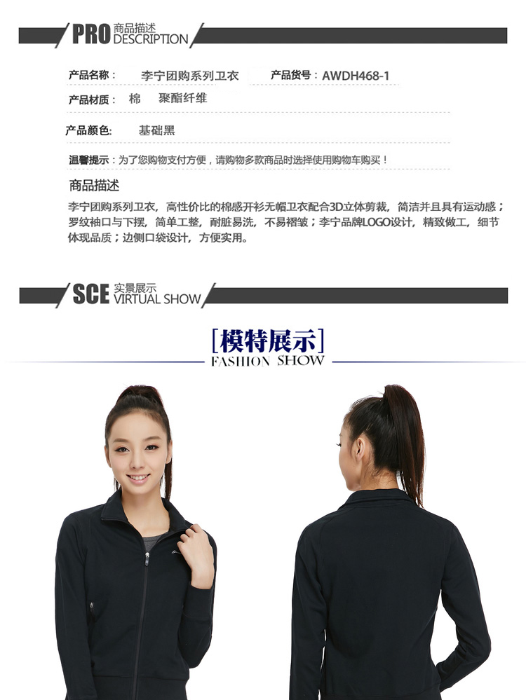 李寧(LI-NING)AWDH486-1 女子團購系列無帽開衫衛(wèi)衣基礎(chǔ)黑XL