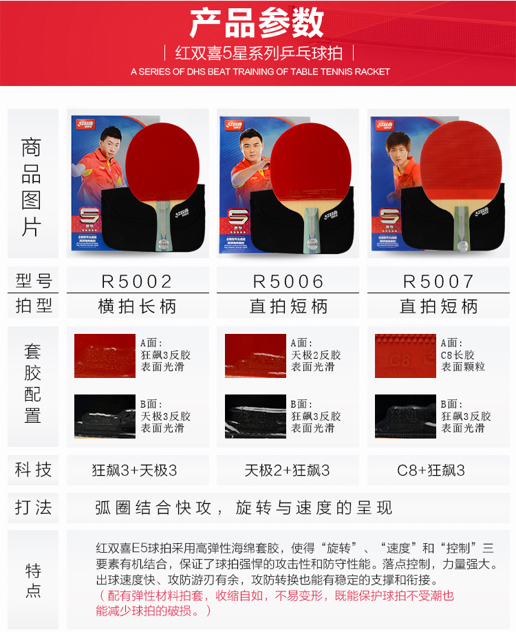 紅雙喜(DHS) R5002-R5003-R5006-R5007五星乒乓球拍