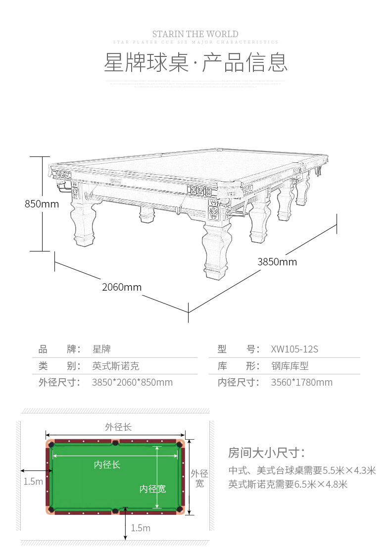 星牌 臺(tái)球桌 XW106-12S英式標(biāo)準(zhǔn)斯諾克俱樂(lè)部用臺(tái)