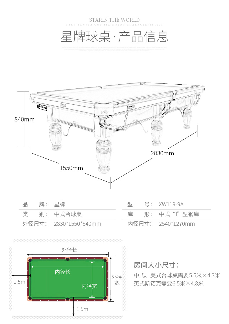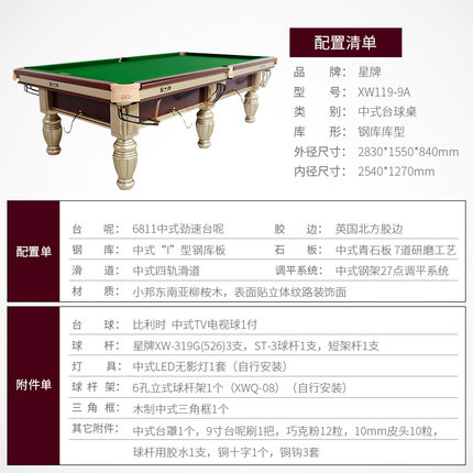 星牌 臺(tái)球桌 XW118-9A中式黑八球臺(tái)